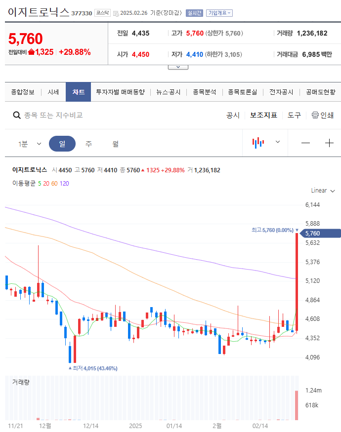최근 4,000원대에서 횡보하던 주가는 급격한 거래량 증가와 함께 5,000원대 저항선을 돌파하며 강세를 보였어요.