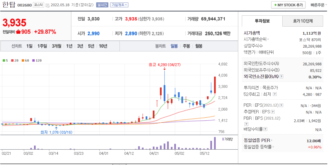 세계 주요 밀 생산구인 인도가 밀 수출을 금지하면서 관련주인 한탑이 상한가로 마무리되었다.
