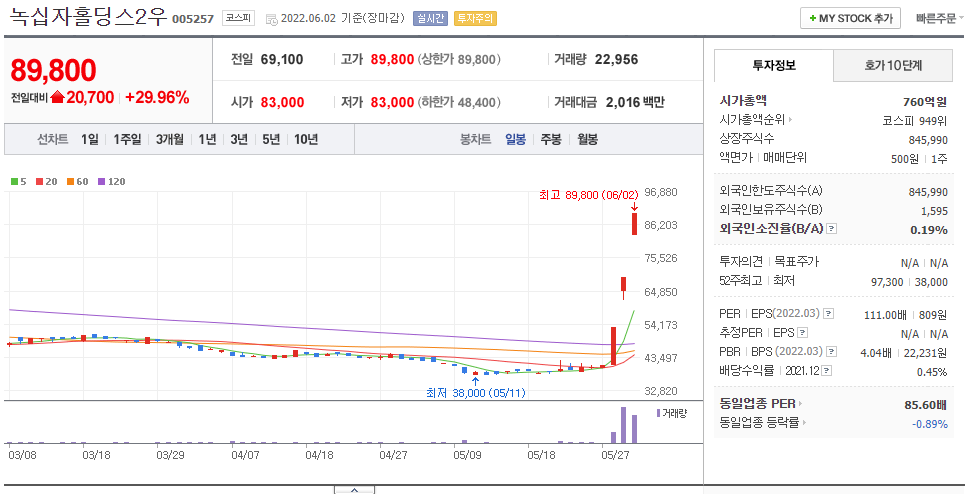 녹십자홀딩스는 녹심자 엠에스의 지주사이다. 녹십자 엠에스는 B형 간엽백신을 개발했으며 간염치료제를 제조, 판매회사다 녹십자 엠에스는 과거 두창백신을 연구개발한 경험을 보유하고 있으며, 코로나진단키트를 개발한 경험이 있어 원숭이두창 진단키트 개발에 대한 기대감과 최근 원인불명의 소아,청소년만 걸리는 원인불명의 급성간염이 전세계적으로 650명이상 환자가 발생하면서 국내에도 이달초 첫의심환자가 나왔다. 원숭이두창과 원인불명 급성간염 소식에 녹십자 계열사중에 주식수가 적은 녹십자 홀딩스2의 매수가 몰리면서 상한가로 마감했다.