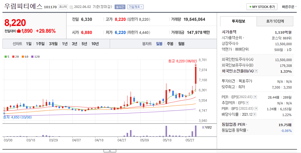 우림피티에스는 철강,조선,산업,중장비,해양플랜트 분야에서 감속기 사업을 영위하는 기업이며 삼성중공업 등 다른업체들과 감속기 개발, 공급에 협렵하고 있는 회사이다. 현정부에서 국책과제로 로봇 정밀감속기의 국산화 개발에 우림피티에스가 나선다는 소식과 삼성전자가 세계최대 전자, 정보기술 전시회인 CES2022에서 반도체,모바일, 가전 등 전 사업 부분의 M&A 가능성을 밝히며 그중에 로봇 반도체와 삼성중공업 사이에 협력이 본격화될것이란 전망에 우림피티에스의 매수가 몰리면서 상한가로 마감했다.