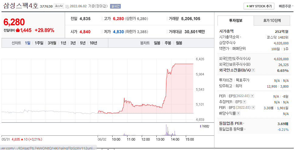 삼성스팩4호 삼성이 공모자금으로 비상장사와 합병하기위해 만든 기업인수목적의 회사이다.삼성그룹의 대규모 인수합병(M&A) 기대감에 상한가로 마무리했다. 삼성전자 DX부분 한종희부회장은 지난달 31일 인수합병 을 뉘한 작업이 진행중이라 알리며 신사업의 대표 사례로 로봇을 꼽았다. 그외 LG디스플레이와 유기발광다이오드 협업 여부또한 모든가능성을 열어놓고 있다고 답하며 기대감을 모았다. 이에 반도체,디스플레이, 로봇 부분에 기대감으로 상한가로 마감했다.