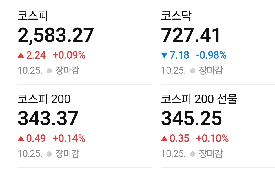 2024년 10월 25일 한국 주식시장은 코스피가 소폭 상승하며 2,583.27포인트로 마감했으며, 코스닥은 727.41포인트로 하락했습니다. 코스피는 기관과 외국인의 순매수에 힘입어 소폭 상승을 유지했고, 오늘 강세 섹터는 2차 전지 관련주와 반도체 섹터였습니다. 반면, 코스닥은 일부 바이오 종목들의 조정으로 인해 하락 마감했습니다.