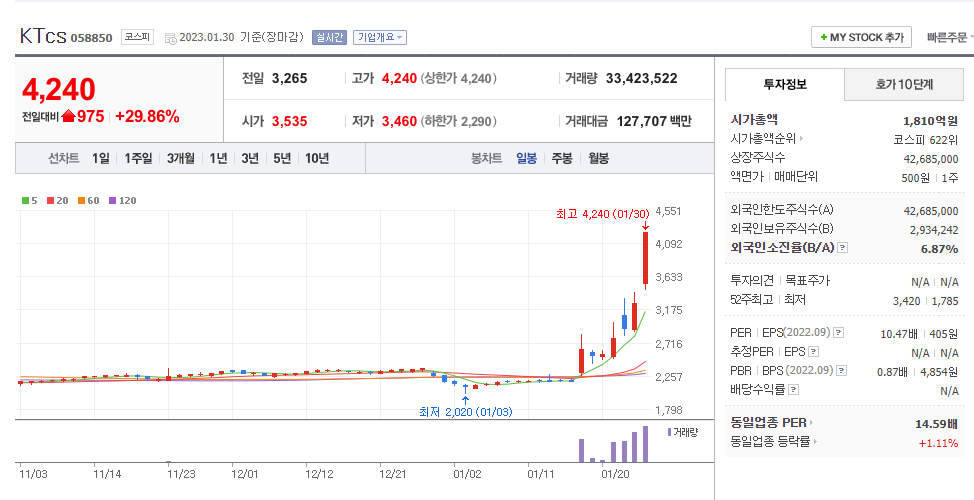 KTcs는 KT의 계열회사로 KT컨택센터,114 사업,유통사업등을 주요 사업으로 영위하고 있다. 최근 KT에서 23년상반기 초거대 AI서비스 '믿음' 을 상용화 추진에 나선다는 소식에 인공지능(AI) 챗봇 '챗GPT" 의 수혜 기대감으로 국내 AI상용화 관련기대감으로 상승 상한가로 마무리 되었다.