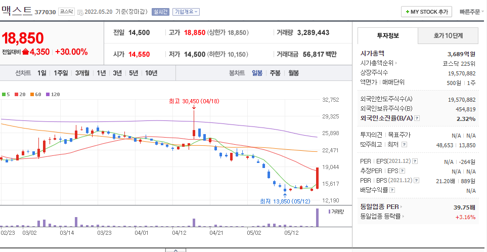 맥스트는 AR원천기술 개발에 집중해온 업체로 10년의 연혁을 가지고있는 기술전문 회사이다. 2021년 7월 27일 코스닥에 상장되면서 매타버스 관련 대표주로 꼽히는 기업이다. 2019년부터는 AR원천기술을 반도체,자동차,조선들 제조현장등에 산업용 증강현실 솔루션을 제공한다. 증강현실 원천기술을 상용화하면서 국내에서 유일하게 AR 소프트웨어를 개발, 플랫폼을 운영하고 있으며 2020년부터 AR기술에 al기술을 접목하여 현실세계를 기반한 메타 버스를 구현할수있는 기수을 상용화를 개발하여 정부의 지원으로 XR메타버스 프로젝트에도 선정되어 다양한 메타버스 플랫폼을 준비하는 대표주의 하나이다. 오늘 상한가요인은 애플이 지난주 이사회에서 곧 출시될 증강현실(AR),가상현실(VR)헤드셋의 시연 소식에 곧출시될거라는 상용화 기대감에 매타버스 관련주로 상한가 마무리했다.