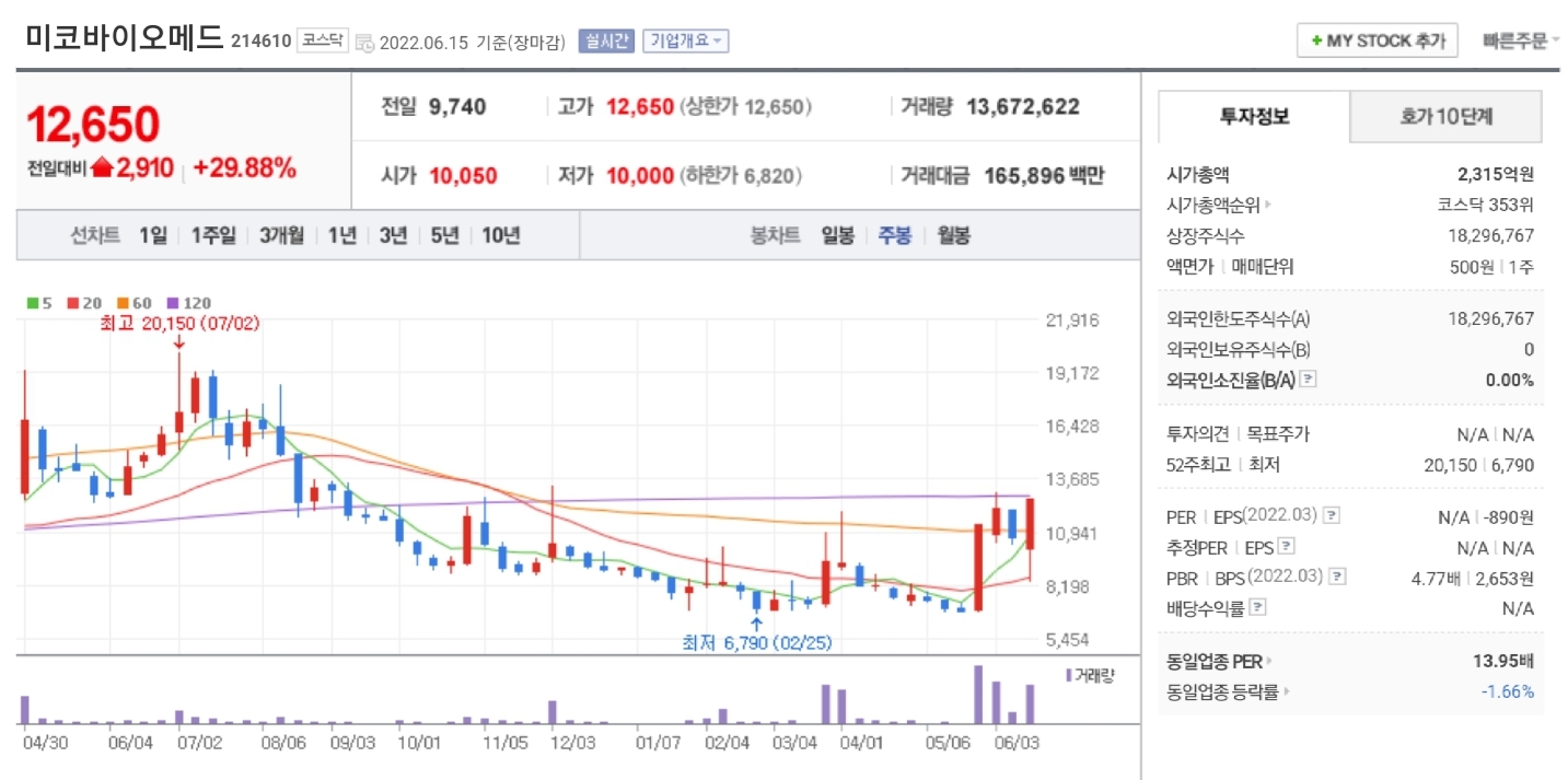 기술 보유는 항원항체 결합을 기반으로 면역 측정법 ELISA 문제점을 개선하는 기술을 보유한 회사이다 오늘 상승 이유는 최근 유럽에서 퍼지고 있는 원수이 두창 감염의 확산세가 가속된다는 소식에 WHO는 공중 비상사태에 해당하는지 평가를 위한 긴급회의를 소집했다 밝히며 상한가 마감을 했다. 미코 바이오메드는 국내 유일하게 원숭이 두창 진단키트를 보유하고 있는 회사다.